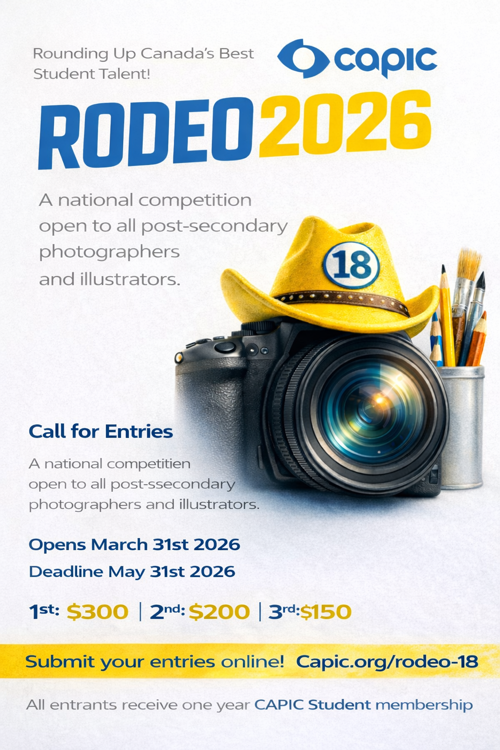 Le CAPIC est ravi d'annoncer la 18e édition du concours RODEO, qui met à l'honneur l'incroyable talent des étudiants en photographie et en illustration de tout le Canada.